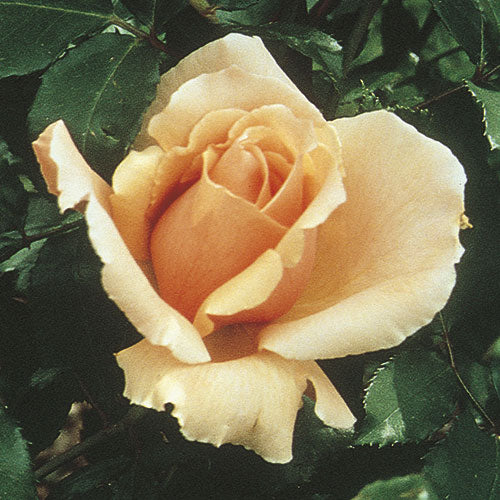 Just scrumptious or just wonderful or just apricot is understandable— but Just Joey? Nevertheless, the big brandy-colored buds, the large ruffled apricot flowers steeped with fruity fragrance, and the huge glossy green leaves have intoxicated many a rose lover. An immigrant from England, the bushy vigorous plant takes well to our shores. Deepest color in moderate consistent temperatures.